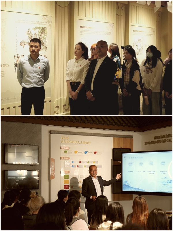 河阳山歌馆位于张家港市凤凰镇,为集展示演艺、学术研究和文化交流等功能于一体的综合性文化设施。走进展馆,非遗传承人龚晓东带领同学们一一参观了历史文物陈列馆、历史名人馆、山歌演艺馆,详细介绍了河阳山歌的历史脉络、文化内涵及艺术特色,馆内丰富的图文资料及历史文物也使同学们对河阳山歌有了初步且直观的认识。通过龚晓东细致的讲解同学们了解到,河阳山歌作为吴歌的重要组成部分,承载着江南水乡的风土人情和人民的生活智慧,具有十分重要的教育价值、历史价值和审美价值,有着不可忽略的文学地位和学术地位。