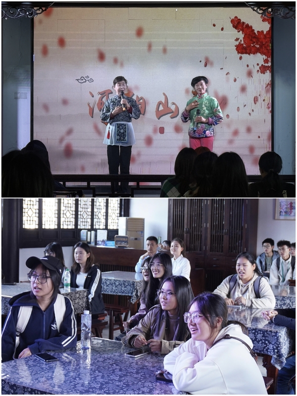 具有6000年历史的河阳山歌是河阳地区劳动人民自己创造的原生态歌谣,代表作《斫竹歌》作为首批国家级非物质文化遗产多次唱响中央电视台,使全国人民充分领略到了河阳山歌的无穷魅力。在展馆的小剧场内,同学们有幸现场观赏到了四位非遗传承人的精彩演绎。演唱者们用真挚的情感和精湛的技艺诠释了河阳山歌的独特魅力,在《日落西山黄里黄》《盘歌》《河阳城里好白相》等充满地域特色的歌词和曲调里,大家仿佛回到了古老的河阳城,感受着先辈们的生活劳作气息。表演结束后,龚晓东现场教授同学们演唱《斫竹歌》,传授河阳山歌的基本唱腔与表演技巧,同学们大声跟唱,在学习与互动中领悟到了河阳山歌演唱及表演的精髓所在,对苏州张家港市拥有这样优秀的文化遗产感到十分骄傲和自豪。