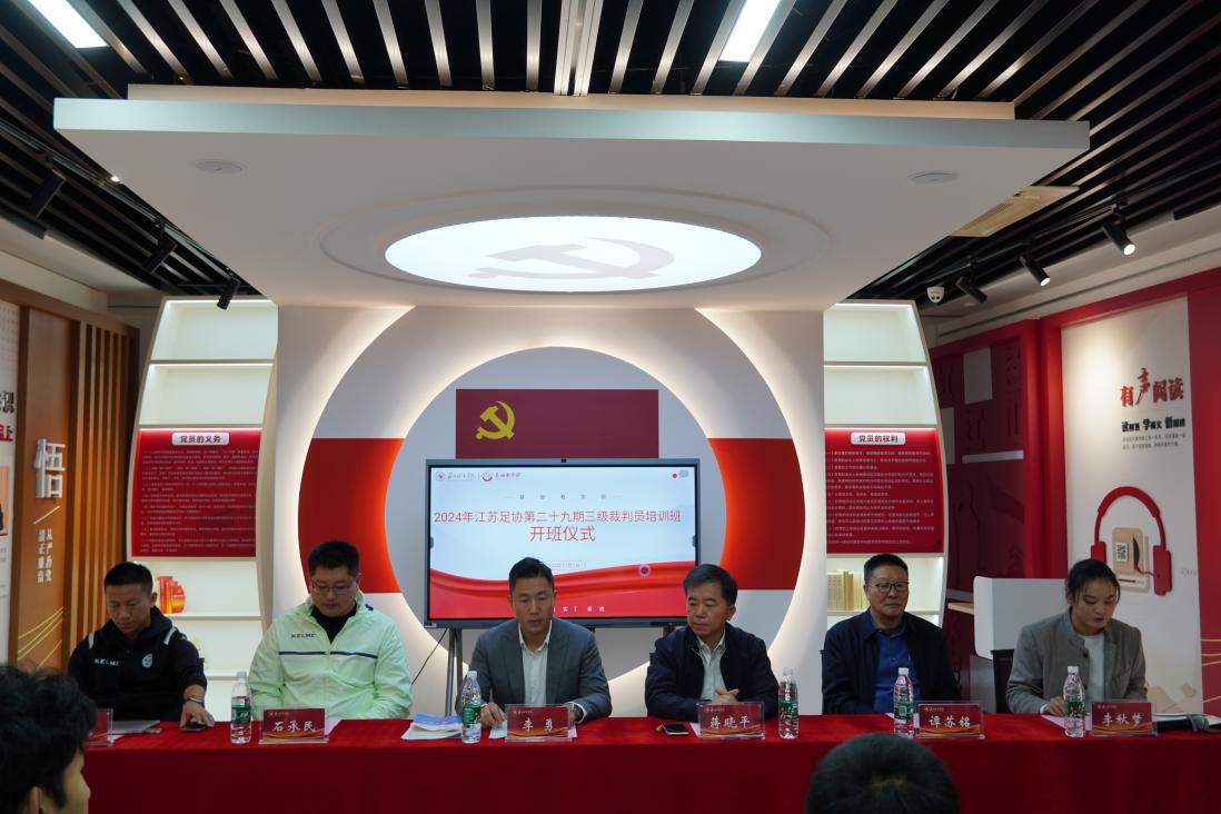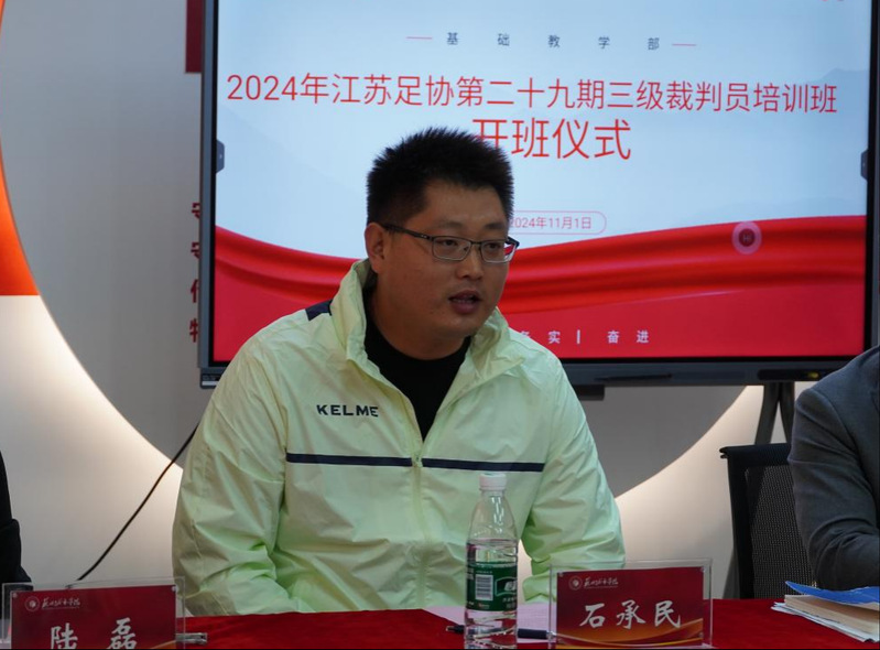 为助力苏州“政校企协同助力产学研融合”发展,积极推动关心下一代工作,促进足球裁判人才队伍的培养和建设,11月1日,由江苏足协主办,苏州市足协、我校发展委员会办公室和基础教学部承办的第二十九期中国足协三级裁判员培训班在我校党建与廉政基地顺利开幕。苏州市足球协会副主席、秘书长蒋晓平,苏州市足球协会副主席、纪律委员会主任谭苏铭,苏州市足球协会技术部部长、裁委会委员石承民,足球国家级裁判员、江苏省足协裁判监督陆磊,基础教学部党委书记、主任李勇,基础教学部教工党支部副书记、体育系副主任李秋梦出席。开幕式由李秋梦主持。