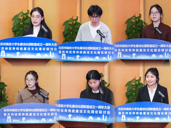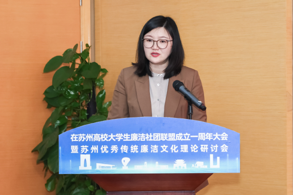 在苏州高校大学生廉洁社团联盟秘书长单位代表王枝老师介绍了在苏州高校大学生廉洁社团联盟近一年的工作开展情况。截至目前,14家大学生廉洁社团全年组织并实施廉洁文化活动100余次。此外,在苏州高校大学生廉洁社团联盟精心组建宣讲团,充分利用周末、节假日及暑假等时段,前往廉政教育基地开展志愿宣讲活动,参与宣讲人员累计350余人次,累计志愿服务时长500余小时。王枝表示,接下来社团联盟将总结工作经验,认真谋划2025年的各项工作,进一步发挥平台与资源优势,凝聚高校和社会各界力量,以更实的作风、更严的标准、更团结的局面,助力“廉洁苏州”建设。