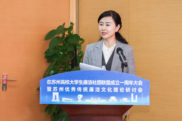 王友良和蒋妍为在苏州高校大学生廉洁社团联盟实践基地授牌。蒋妍代表团市委向在苏州高校大学生廉洁社团联盟成立一周年表示祝贺。她表示大学生廉洁社团联盟是青年廉洁素养提升工程的重要载体,联盟成立一年已初步展现出蓬勃的生机与活力,接下来要进一步深挖苏州优秀传统文化精髓,创新廉洁教育的青年化阐释,充分发挥联盟的系统作用、聚合作用、牵引作用、保障作用,让“廉洁”成为团员和青年优良品质和行为准则,筑牢青年廉洁思想根基,在全面推进中国式现代化苏州新实践中挺膺担当、赶超奋进。