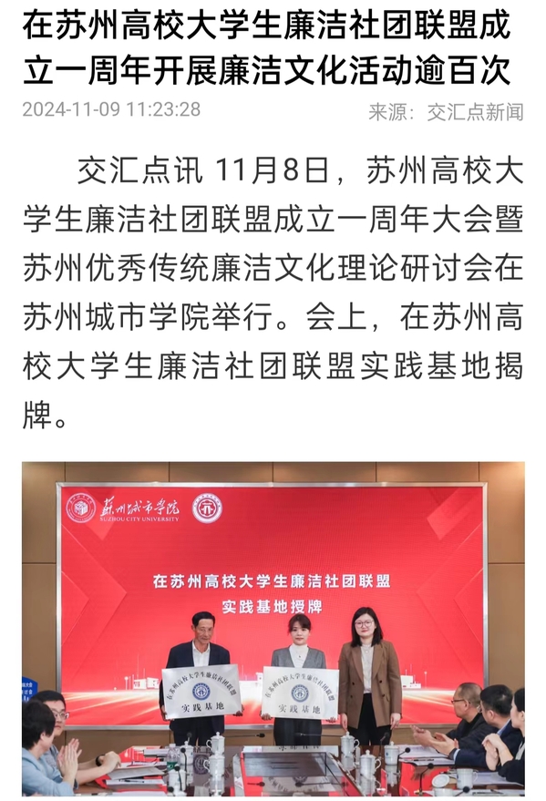 11月8日,苏州高校大学生廉洁社团联盟成立一周年大会暨苏州优秀传统廉洁文化理论研讨会在苏州城市学院举行。会上,在苏州高校大学生廉洁社团联盟实践基地揭牌。
