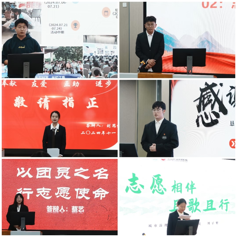 前期经个人申请、组织推荐、校团委审核,共有15位候选人进入“十佳志愿者”答辩评选环节。评比现场,候选人从参加大型赛会、社区治理、乡村振兴、绿色环保、助老助残等各领域志愿服务事迹和体会感悟等方面进行5分钟的现场展示和2分钟的现场答辩。经过激烈角逐,最终刘思琪等十位同学脱颖而出,荣获苏州城市学院2023-2024学年“十佳志愿者”荣誉称号。