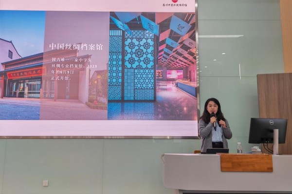 正式开始之前,杨海华以“你了解的苏州传统文化”为题,与学生进行交流,在互动中迅速将同学们带入课堂。随后,吴芳回溯了苏州丝绸的起源与发展,另辟蹊径从档案学的视角为同学们打开品读苏州丝绸文化的新世界。吴老师以“世界记忆里的丝绸文明”“文化遗产中的丝绸记忆”“时代特点下的档案故事”“数字战略中的档案智慧”四块拼图为主线,以一件件丝绸档案为载体,向同学们展示了苏州丝绸文化的绝美风采,带领大家体验了一场“丝绸文化盛宴”。