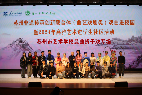 为深入学习贯彻习近平文化思想,推动苏州戏曲类非物质文化遗产保护传承与创新发展,11月12日,苏州曲艺戏剧类非遗传承创新联合体戏曲进校园暨2024年高雅艺术进学生社区活动在我校多功能厅举行。本次活动由苏州曲艺戏剧类非遗传承创新联合体主办,苏州城市学院和苏州市艺术学校联合承办,我校党委常委、副校长高雷,苏州市艺术学校党支部书记、校长王臻,出席本次活动并致辞。我校教务处、党委学生工作部(学生工作处)、团委(美育中心)、设计与艺术学院等部门和学院负责人,苏州市艺术学校相关负责人,以及400余名师生代表共同参加了活动。