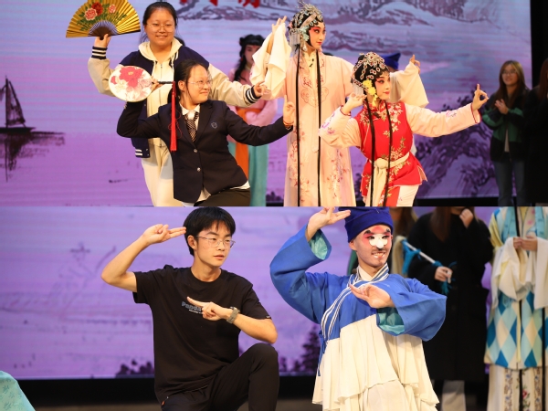 在本场昆曲折子戏展演中,《扈家庄》《义侠记·游街》《玉簪记·琴挑》《牡丹亭·游园》《访测》《盗王坟》《佳期》《盗草》等经典剧目轮番演绎,戏曲演员们身着盛装相继登场,优雅的唱腔,华美的服饰,一颦一笑、一招一式,极富感染力,深深地吸引着在场的每一位师生。在活动最后的戏曲互动环节,现场气氛可谓是异常热烈,学生们踊跃上台参与,在专业戏曲老师指导下,大家模仿起来有板有眼,举手投足之间,已然隐隐展现出了专业戏曲演员那般的独特风采。