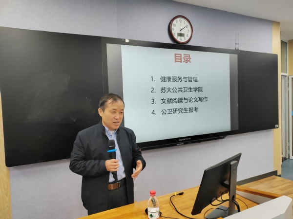 秦立强院长的讲座围绕健康服务与管理专业的发展前景、苏州大学医学院公共卫生学院的概况、文献阅读与论文写作的技巧、公共卫生研究生报考四个方面进行了深入浅出的讲解。