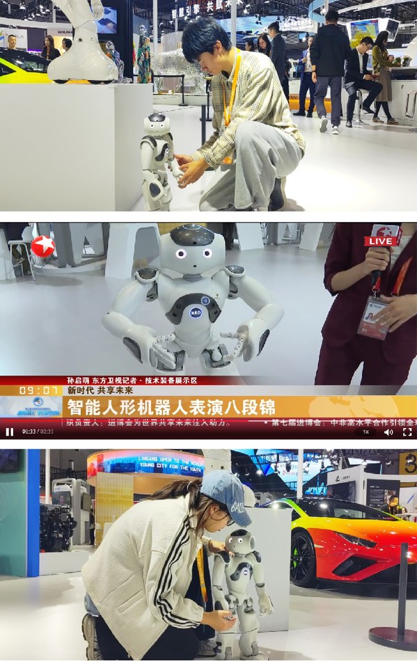 周敏彤老师介绍,学校的人形机器人实验室自从去年年初建设完成后,依托于软银机器人这一人形机器人平台,将工科专业、康养专业和艺术专业的老师和学生结合到一起,申报智慧课堂项目、参加AI+新医科、AI+新文科相关的竞赛等,取得了令人欣喜的成绩,在执行项目和准备比赛的过程中,学生们得到了充分的锻炼,在专业技能和创新思想上有了长足的进步。这次进博会,社团同学们获得了一次极好的学以致用的机会,同学们也不辱使命,在进博会这个高层次的国际平台上充分展示自己的机器人创新成果,得到软银机器人公司科研人员的夸赞和指导,也获得了现场观众的广泛欢迎。