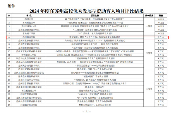 近日,苏州市教育局公布了在苏州高校优秀资助育人项目评审结果,我校党委学生工作部(学生工作处)报送的项目——数字赋能,聚焦“五育”行为,探索发展型资助新路径发展型资助育人项目,经现场汇报、专家组评审和中共苏州市委教育工作委员会审定,获评二等奖,并获得8万元资助项目奖励。