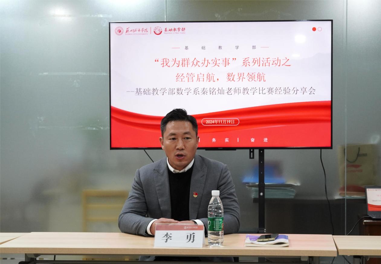 为深入学习贯彻党的二十届三中全会精神,全面发挥党建引领作用,积极推动关心下一代工作,切实提高为群众办实事的质量水平,11月19日,基础教学部和数字经济与管理学院共同举办“我为群众办实事”系列活动之经管启航,数界领航——教学比赛经验分享会,邀请基础教学部数学系教师秦铭灿到场分享经验。基础教学部党委书记、主任李勇,数字经济与管理学院党委副书记尹维军和副院长李惠娟出席,数字经济与管理学院和基础教学部部分教师参加本次活动。