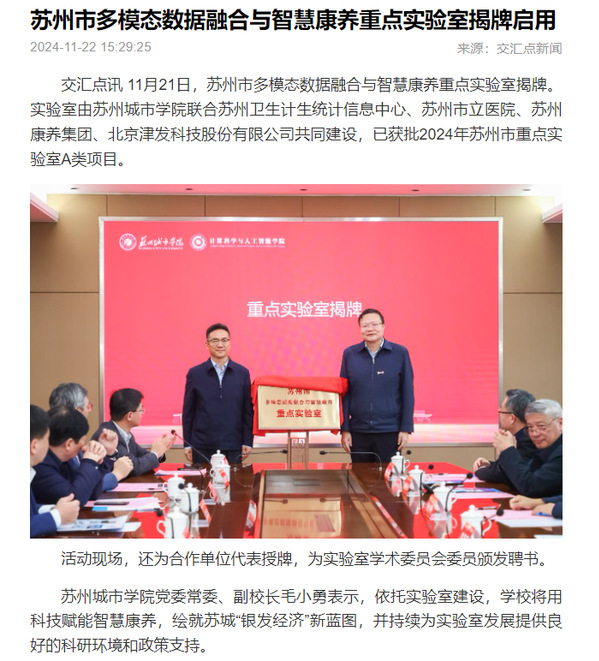 11月21日,苏州市多模态数据融合与智慧康养重点实验室揭牌。实验室由苏州城市学院联合苏州卫生计生统计信息中心、苏州市立医院、苏州康养集团、北京津发科技股份有限公司共同建设,已获批2024年苏州市重点实验室A类项目。