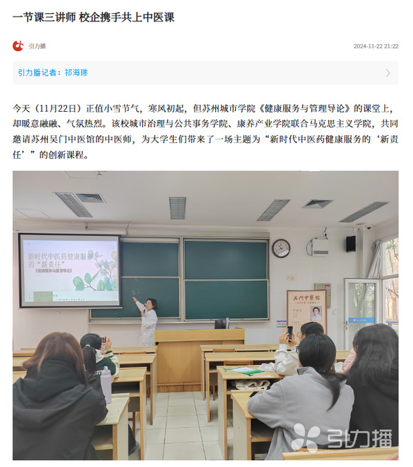 今天(11月22日)正值小雪节气,寒风初起,但苏州城市学院《健康服务与管理导论》的课堂上,却暖意融融、气氛热烈。该校城市治理与公共事务学院、康养产业学院联合马克思主义学院,共同邀请苏州吴门中医馆的中医师,为大学生们带来了一场主题为“新时代中医药健康服务的‘新责任’”的创新课程。