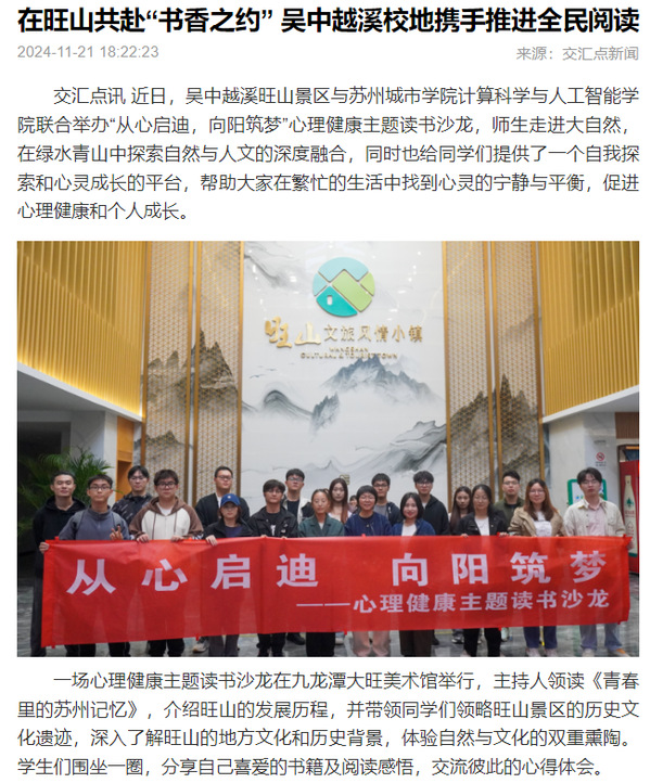 一场心理健康主题读书沙龙在九龙潭大旺美术馆举行,主持人领读《青春里的苏州记忆》,介绍旺山的发展历程,并带领同学们领略旺山景区的历史文化遗迹,深入了解旺山的地方文化和历史背景,体验自然与文化的双重熏陶。学生们围坐一圈,分享自己喜爱的书籍及阅读感悟,交流彼此的心得体会。