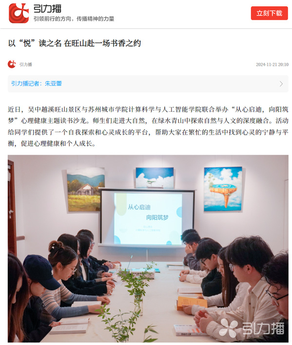 近日,吴中越溪旺山景区与苏州城市学院计算科学与人工智能学院联合举办“从心启迪,向阳筑梦”心理健康主题读书沙龙。师生们走进大自然,在绿水青山中探索自然与人文的深度融合。活动给同学们提供了一个自我探索和心灵成长的平台,帮助大家在繁忙的生活中找到心灵的宁静与平衡,促进心理健康和个人成长。