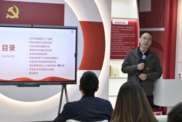 接下来,王淼教授做《践行党的二十届三中全会精神,融入时代创新热潮》的专题讲座。他从习近平总书记所强调的三个核心话题切入,以丰富而全面的视角,深入剖析了我国科技发展的历史性成就、总结了科技发展过程中的重要经验,并阐述了增强科技发展紧迫感的必要性。王教授指出,当前国际科技竞争日趋白热化,我国既面临着严峻的挑战,也孕育着无限机遇。作为理工科人才的后备力量,我们不仅要打下扎实的专业知识基础,更要积极培养创新意识和实践能力。紧跟时代发展的步伐,深入学习党的创新理论,将个人的成长融入国家发展大局,为实现中华民族伟大复兴的中国梦贡献自己的青春力量。