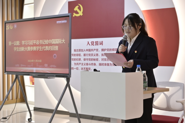 会议伊始,开展第一议题学习活动。学生第一党支部孙蒙恩领学《习近平总书记给中国国际大学生创新大赛参赛学生代表的回信》并进行深入分享。她从自身学习和实践的角度出发,结合回信中的重要指示精神,分享了自己对于创新、实践和个人成长的理解与感悟。她鼓励同学们积极响应习近平总书记的号召,勇于探索、敢于创新,将个人理想融入国家发展大局之中,努力成为新时代的建设者和接班人。