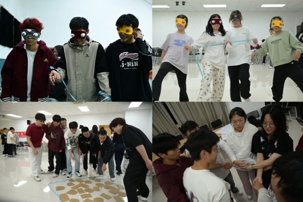 本次活动设计“团体组建”“超级电脑”“心有千千结”“蒙眼过河”四个项目,将班级同学分成若干小组开展活动。在“团队组建”环节中,各队伍紧张有序的设计队名、队徽、队歌及口号,随后通过分组进行展示。在“超级电脑”游戏中,同学们需要在其他队伍持续的拍手声、跺脚声的干扰下迅速完成对应任务,是一场对同学们专注力的考验。“心有千千结”检验了团队协作的力量,手拉手的紧密连接彰显了团结和友谊的不断增长。“蒙眼过河”依赖于同学间彼此信任,通过快速适应黑暗,深入体验游戏,增强了队员间的沟通和信任。