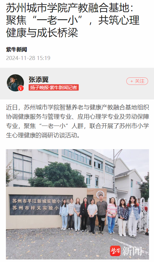 近日,苏州城市学院智慧养老与健康产教融合基地组织协调健康服务与管理专业、应用心理学专业及劳动保障专业,聚焦“一老一小”人群,联合开展了苏州市小学生心理健康的调研访谈活动。
