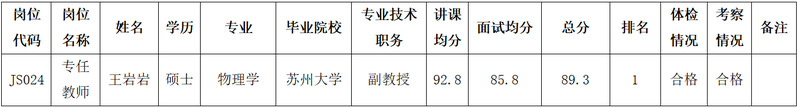 根据《苏州城市学院2024年度下半年高层次人才招聘公告》,经过试讲、面试考核、资格复审、心理测试、体检、政审等程序,拟录用以下1名同志,现公示如下: