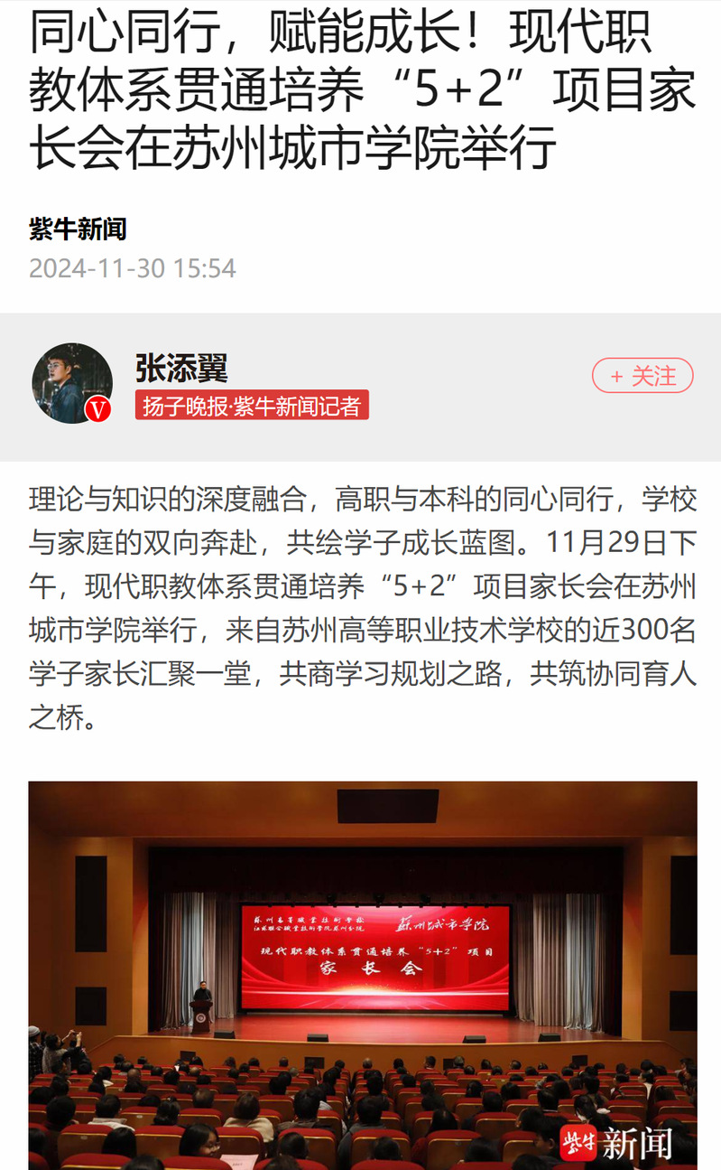 理论与知识的深度融合,高职与本科的同心同行,学校与家庭的双向奔赴,共绘学子成长蓝图。11月29日下午,现代职教体系贯通培养“5+2”项目家长会在苏州城市学院举行,来自苏州高等职业技术学校的近300名学子家长汇聚一堂,共商学习规划之路,共筑协同育人之桥。