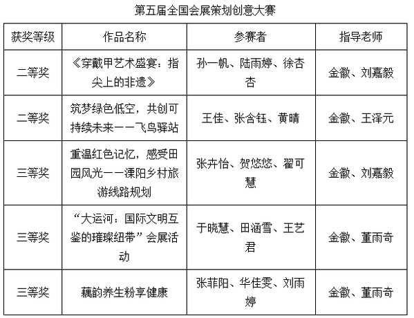 我院参赛团队在金徽老师、刘嘉毅老师、董雨奇老师、王泽元老师的带领下历时数月精心筹备、刻苦钻研,分别选择乡村会展活动创意策划组别的非遗文创手工艺品、国际文明互鉴“一带一路”、乡村会展旅游线路规划与活动创意策划(特色农业)等组别,撰写了周密详尽的策划方案,最终从众多参赛项目中脱颖而出。