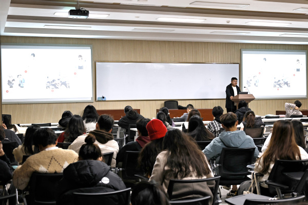 李钦从自主学习、集体活动、生涯规划三个维度介绍学院学风建设工作,并向大家展示了2023-2024学年获评校级“文明班级”与“优良学风班”的班级名单以及2023年升学总体数据,以此鼓励同学们积极发展自我。