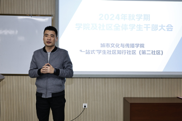 为加强学生干部队伍建设,提升学生干部思想政治素养,11月27日,城市文化与传播学院联合“一站式”学生社区知行社区(第二社区)于国际交流学院301组织召开全体学生干部大会。城市文化与传播学院全体辅导员、学院及社区学生干部参与。会议由城市文化与传播学院团学工作办公室主任沈耀主持。