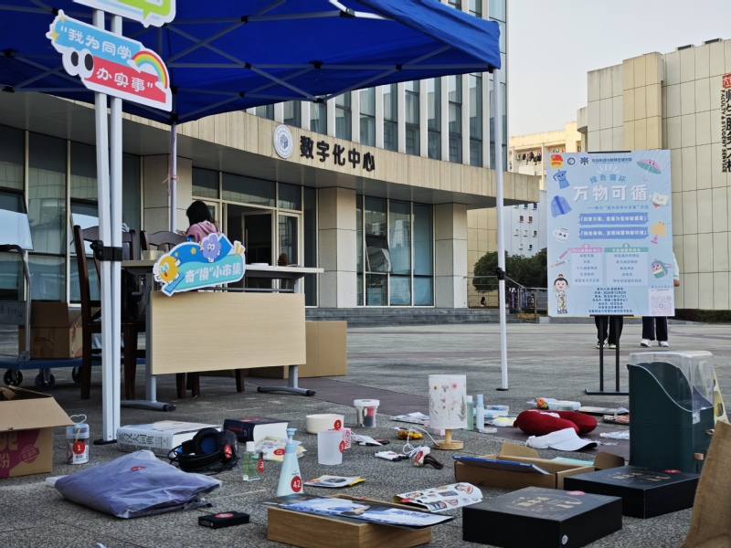 活动前期,同学们积极响应,提供自己的闲置物品,从学习用品到运动装备,从生活用具到时尚单品……每一件物品都是同学们坚定环保信念的象征,亦是爱心和资源的温暖交汇。经过工作人员的细致筛选,合格的单品进入奇“换”小市集等待新主人,同学们也获得通往集市的珍贵入场券,开启资源循环利用的神奇之门。活动当天,数字化中心门口成了热闹非凡的绿色集市。“同学,请问这个可以交换吗?”“这个很适合我哎!”“它应该在这里等我很久了。”在这里,每一件物品都超越了物质本身的价值,搭建起一个个关于循环利用、共享价值的生动故事,实现资源的优质配置,是对可持续生活方式的美好探索与实践。“绿小纸”旧物改造创意摊位上,废旧瓶子摇身一变成为精巧别致的存钱罐,废弃纸张重获新生化身独一无二的装饰品,同学们天马行空的想象力和独具匠心的创造力在这里熠熠生辉,在有限的资源中探索无限的可能,让每一份“废弃物”找到属于自己的舞台。
