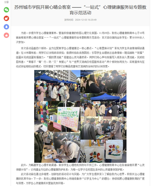 为进一步提升学生心理健康素养,营造积极健康的校园心理文化氛围,11月29日,我校心理健康教育中心于10号宿舍楼前开展心晴会客室——“一站式”心理健康服务站专题教育示范活动,本次活动面向全体学生,累计2000余人次参加。