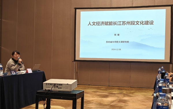来自长江沿线的高等院校、科研院所200余名专家代表齐聚一堂,共话“长江文化的时代价值与‘十五五’发展前瞻”,开展“数字文明时代与长江文化”“流域环境与长江文化”两场主旨报告,以及“长江文明溯源研究”“长江国家文化公园建设研究”“长江文化保护与传承弘扬实践研究”“长江文化发展报告”四场平行论坛。陈璇教授在大会上作了题为《人文经济赋能苏州长江文化建设》的专题报告。长江是大运河苏州段的重要水源之一,穿城而过的大运河形成了苏州“三横四直”的水系格局,孕育了独特的文化特征。陈璇教授在系统梳理长江苏州段的历史变迁和建设现状的基础上,提出了成为文明地标、对外交流的前沿窗口、文化引领区域发展的示范基地、生态文明和谐共生等建设发展目标,以及科学谋划、对外交流、产业赋能、生态优先等建设路径与策略。她表示,苏州很荣幸入选长江文化发展标杆型城市,未来,苏州将继续依托经济优势与区位优势,将长江苏州段建设成为长江国家文化公园的重要示范段。