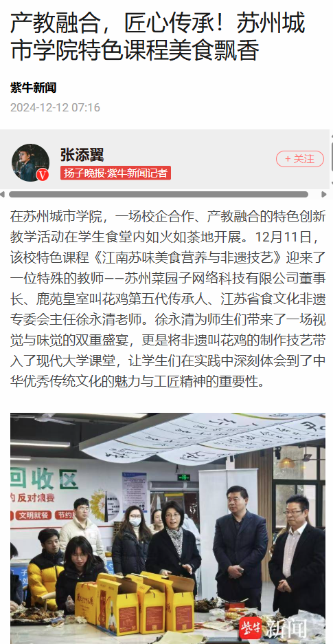 在苏州城市学院,一场校企合作、产教融合的特色创新教学活动在学生食堂内如火如荼地开展。12月11日,该校特色课程《江南苏味美食营养与非遗技艺》迎来了一位特殊的教师——苏州菜园子网络科技有限公司董事长、鹿苑皇室叫花鸡第五代传承人、江苏省食文化非遗专委会主任徐永清老师。徐永清为师生们带来了一场视觉与味觉的双重盛宴,更是将非遗叫花鸡的制作技艺带入了现代大学课堂,让学生们在实践中深刻体会到了中华优秀传统文化的魅力与工匠精神的重要性。