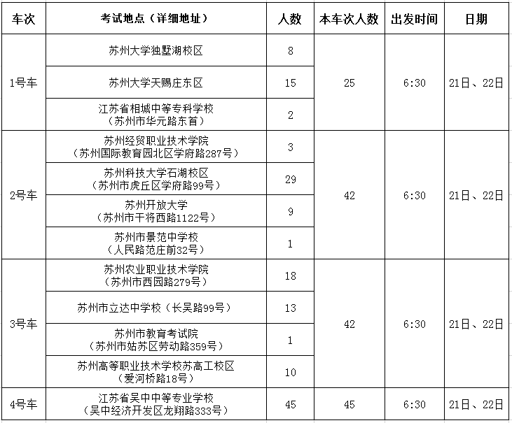 注:苏州工业职业技术学院(吴中大道国际教育园南区瑶泉路6号门)、苏州建设交通高等职业技术学校(吴中大道国际教育园南区)、苏州旅游与财经高等职业技术学校(吴中大道国际教育园南区)因离我校很近,故不安排送考,请在这三个考点参考的学生自行前往。