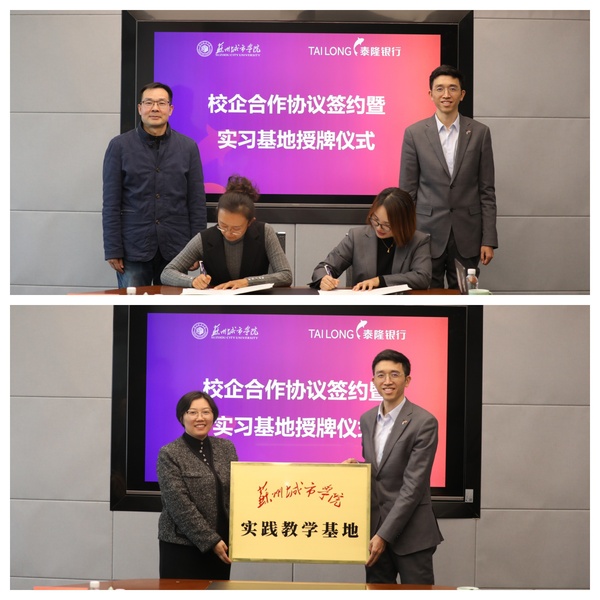 12月19日,我院与泰隆银行携手迈出深化产教融合关键一步,于泰隆银行苏州分行隆重举行实践教学基地签约挂牌仪式。泰隆银行苏州分行副行长宗在元、吴中支行行长葛宇杰、吴中支行副行长曾莺莺、苏州分行人力资源部总经理李银环、苏州分行营业部团队总韦文峰、苏州分行招聘管理岗盛庆龄出席仪式。学院党委副书记尹维军、副院长李惠娟、教务处实践教学科科长孔荣、金融学专业骨干教师姜帅、学院教学科研办公室主任冯李、学院团委书记庄炜参加。