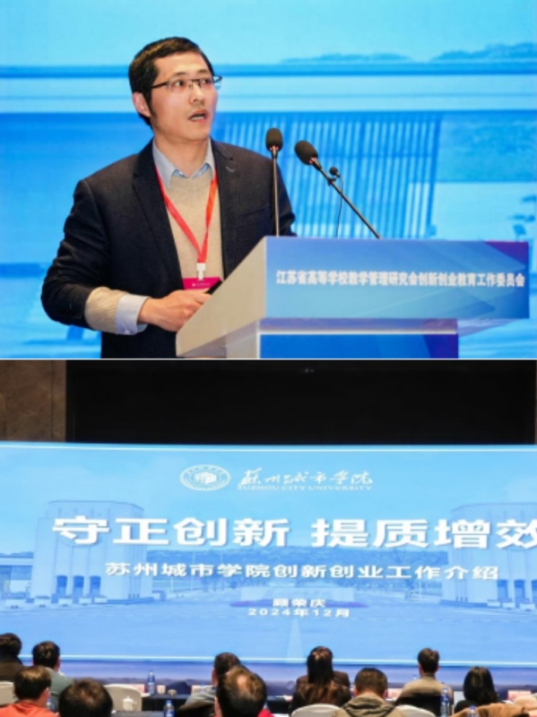 作为2024年创新大赛成绩突破高校的代表,我校被会议主办方邀请作大赛经验分享。会上,教务处副处长顾荣庆作了《守正创新 提质增效——苏州城市学院创新创业工作介绍》的报告,他首先向与会人员介绍苏州城市学院建设发展的基本情况,接着,他从创业教育、科创实践、竞赛获奖、大学生创业园建设、产教融合发展五个方面入手,展示我校近年来在创新创业教育工作方面的努力及成效;基于创新大赛,他重点分享了学校在项目挖掘、备赛、参赛过程中的角色分工与要点落实。最后,他欢迎各兄弟院校莅临我校指导创新创业工作,不断加强合作交流,通过资源共享、优势互补,积极培养具有创新精神和实践能力的优秀人才。