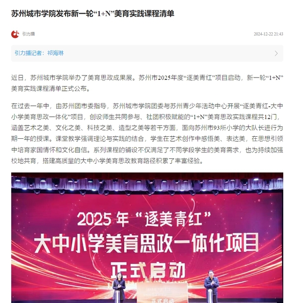 近日,苏州城市学院举办了美育思政成果展。苏州市2025年度“逐美青红”项目启动,新一轮“1+N”美育实践课程清单正式公布。