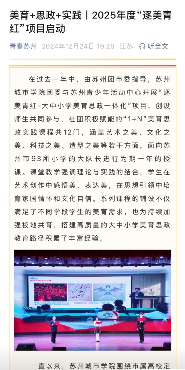 在过去一年中,由苏州团市委指导,苏州城市学院团委与苏州青少年活动中心开展“逐美青红-大中小学美育思政一体化”项目,创设师生共同参与、社团积极赋能的“1+N”美育思政实践课程共12门,涵盖艺术之美、文化之美、科技之美、造型之美等若干方面,面向苏州市93所小学的大队长进行为期一年的授课。课堂教学强调理论与实践的结合,学生在艺术创作中感悟美、表达美,在思想引领中培育家国情怀和文化自信。系列课程的铺设不仅满足了不同学段学生的美育需求,也为持续加强校地共育,搭建高质量的大中小学美育思政教育路径积累了丰富经验。