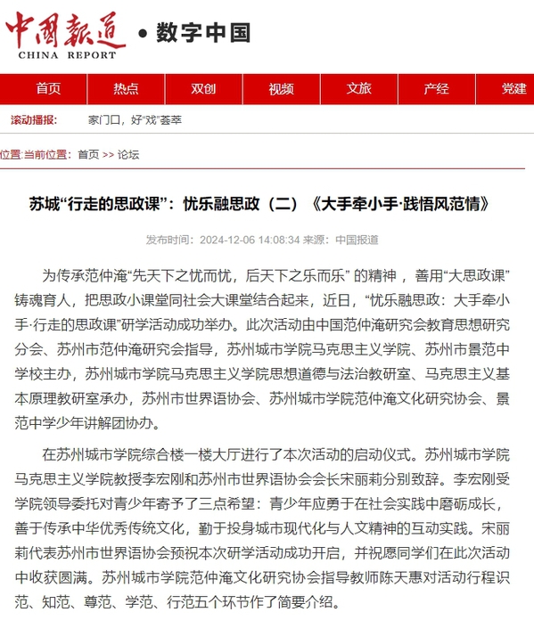 为传承范仲淹“先天下之忧而忧,后天下之乐而乐” 的精神 ,善用“大思政课”铸魂育人,把思政小课堂同社会大课堂结合起来,近日,“忧乐融思政:大手牵小手·行走的思政课”研学活动成功举办。此次活动由中国范仲淹研究会教育思想研究分会、苏州市范仲淹研究会指导,苏州城市学院马克思主义学院、苏州市景范中学校主办,苏州城市学院马克思主义学院思想道德与法治教研室、马克思主义基本原理教研室承办,苏州市世界语协会、苏州城市学院范仲淹文化研究协会、景范中学少年讲解团协办。