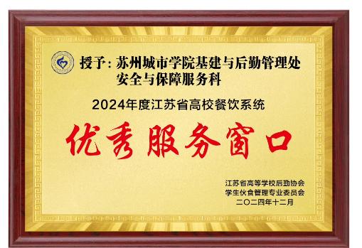 为全面贯彻落实习近平总书记对江苏“四个走在前”“四个新”重大任务,推进“十四五”规划目标,擦亮高校餐饮人“保障为先 服务至上”的“金字招牌”,江苏省高等学校后勤协会学生伙食管理专业委员会开展2024年江苏省高校餐饮系统优秀服务窗口、优秀服务标兵评选活动。近日,江苏省高等学校后勤协会公布了《关于表彰2024年度江苏省高校餐饮系统优秀服务窗口、优秀服务标兵的通知》,我校基建与后勤管理处安全与保障服务荣获“2024年度江苏省高校餐饮系统优秀服务窗口”称号。