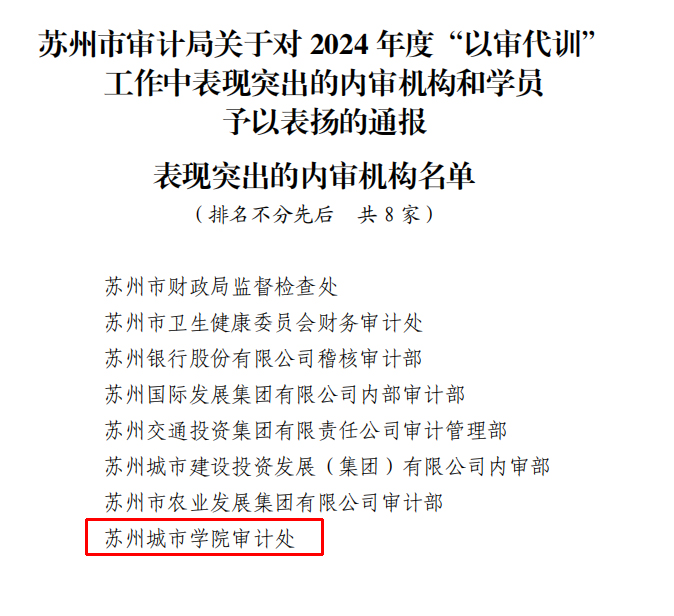 近日,苏州市审计局发布《关于对2024年度“以审代训”工作中表现突出的内审机构和学员予以表扬的通报》,我校审计处获评“表现突出的内审机构”。