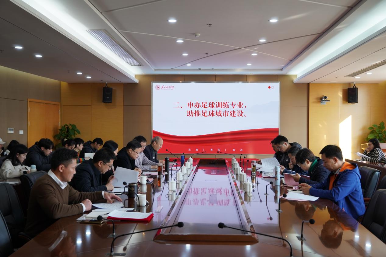 会议第二阶段围绕申办足球训练专业进行。许宜申首先阐述了专业申报的程序及要求,详细介绍了申报工作的各个环节和注意事项。随后,李勇汇报了申报专业的现状,包括学部目前的师资力量、人才储备、教学设施、课程设置、场馆建设等方面的情况。随后,参会领导围绕申办工作展开了热烈的讨论。
