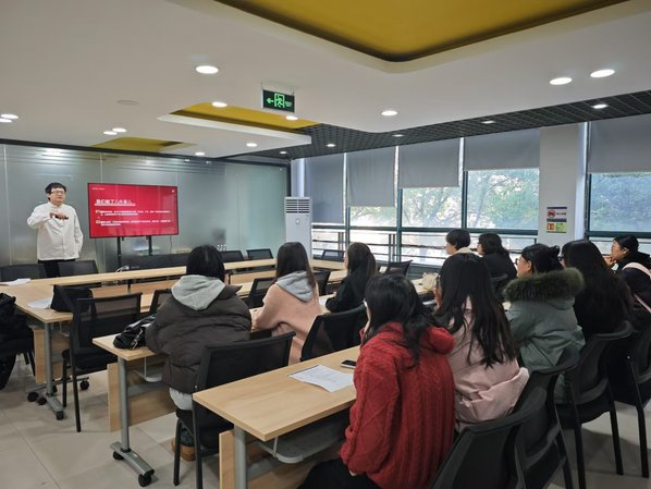宣讲会上,田伟晨详细介绍了公司的历史脉络、发展成就以及未来发展方向,随后介绍了公司招聘、实习岗位,阐明人才培训计划,向同学们展示了公司晋升阶梯、福利待遇等。