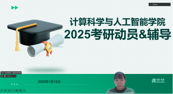 1月13日晚,计算科学与人工智能学院举办了一场“2025年考研动员及辅导”线上分享会,助力考研意向学生明确方向、坚定决心、科学备考。分享会由院长助理龚兰兰主讲,众多学生参与。