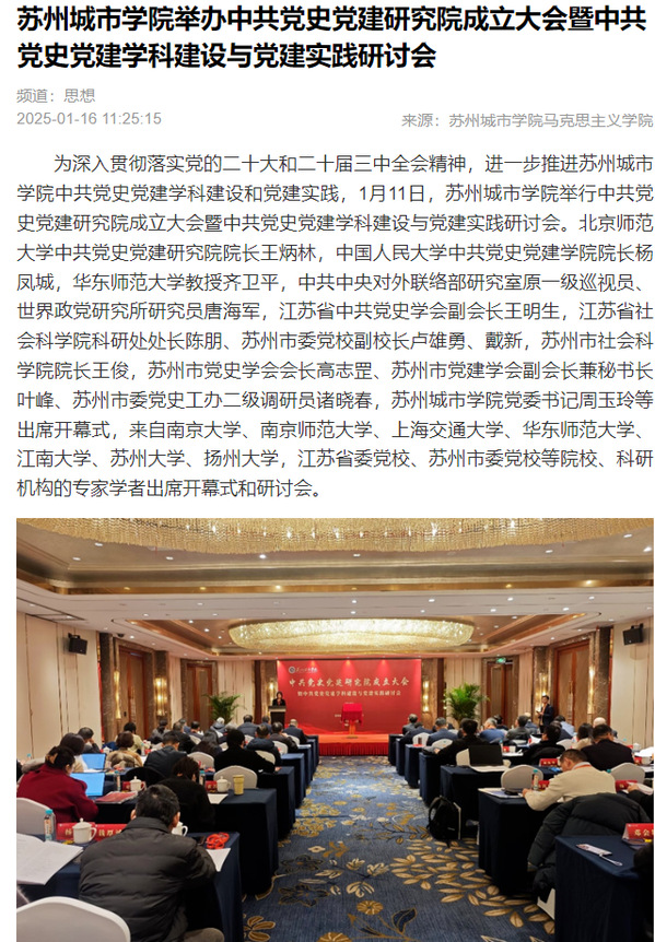为深入贯彻落实党的二十大和二十届三中全会精神,进一步推进苏州城市学院中共党史党建学科建设和党建实践,1月11日,苏州城市学院举行中共党史党建研究院成立大会暨中共党史党建学科建设与党建实践研讨会。北京师范大学中共党史党建研究院院长王炳林,中国人民大学中共党史党建学院院长杨凤城,华东师范大学教授齐卫平,中共中央对外联络部研究室原一级巡视员、世界政党研究所研究员唐海军,江苏省中共党史学会副会长王明生,江苏省社会科学院科研处处长陈朋、苏州市委党校副校长卢雄勇、戴新,苏州市社会科学院院长王俊,苏州市党史学会会长高志罡、苏州市党建学会副会长兼秘书长叶峰、苏州市委党史工办二级调研员诸晓春,苏州城市学院党委书记周玉玲等出席开幕式,来自南京大学、南京师范大学、上海交通大学、华东师范大学、江南大学、苏州大学、扬州大学,江苏省委党校、苏州市委党校等院校、科研机构的专家学者出席开幕式和研讨会。