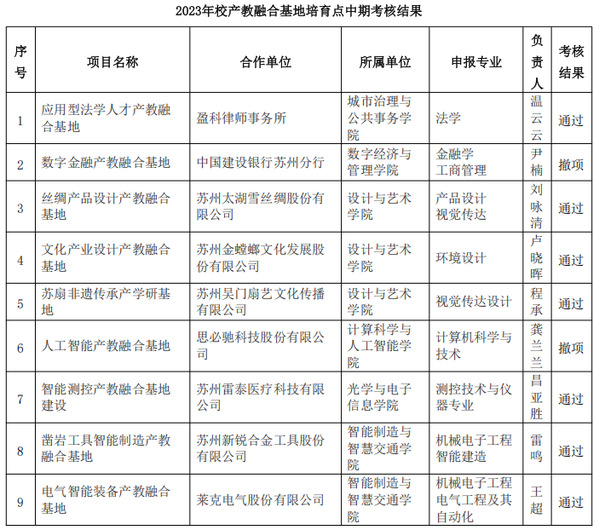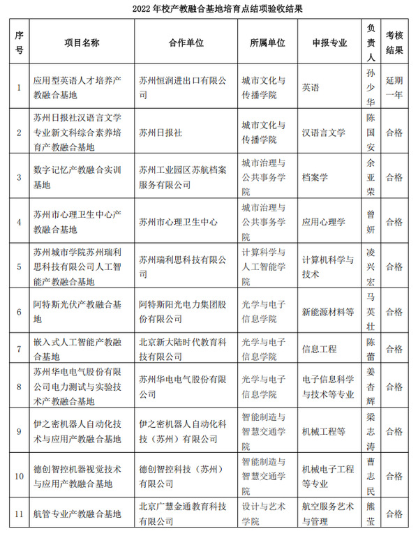 根据《苏州城市学院产教融合基地建设实施细则(试行)》通知,经学院(部)初审、项目负责人汇报、专家评审,对2022年、2023年校产教融合基地培育点进行了结项验收、中期考核,现将结果公示如下: