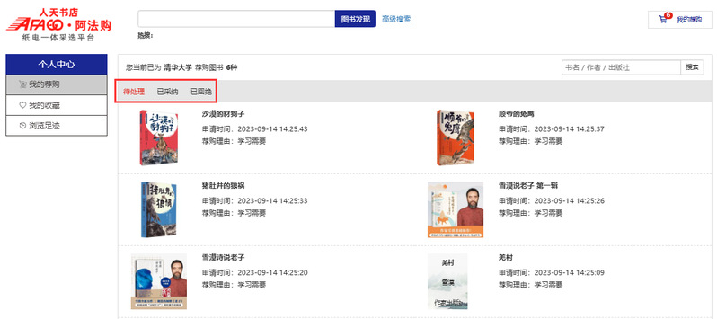 4、我的荐购:【个人中心】→【我的荐购】中可查看到所有的荐购书目,及图书馆的采纳情况。