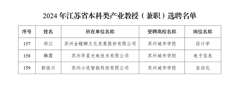 近日,江苏省教育厅等四部门发布《关于公布2024年江苏省产业教授(兼职)选聘名单的通知》,我校推荐申报的苏州金螳螂文化发展股份有限公司郑江、苏州华星光电技术有限公司鞠霞、苏州小优智能科技有限公司郭俊兴等3位兼职教师获批江苏省本科类产业教授。