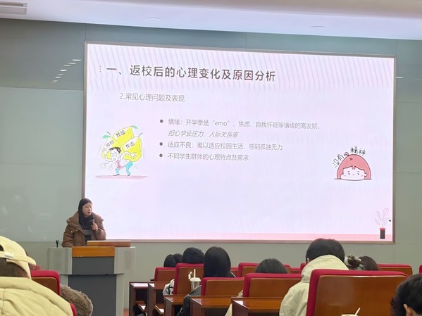 为深入贯彻落实《苏州城市学院“润心”行动实施方案》,充分发挥心理委员在校园心理健康工作中的桥梁纽带作用,营造“人人关注心理健康,人人拥有健康心理”的良好校园氛围,3月6日晚,我校心理健康教育中心在3-101教室成功举办2025年春学期心理委员培训。本次培训以“返校心情解析——从忐忑到适应”为主题,由心理健康教育中心沈怡佳主讲,2022级至2024级全体心理委员参加。