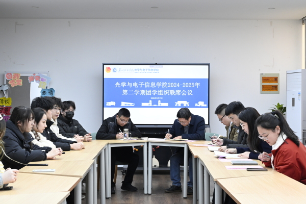 为进一步凝聚团学组织力量,明确新学期工作方向,光学与电子信息学院于3月7日下午在心理团辅室召开了2025年春学期团学组织联席会议。学院党委书记冒维东,团学工作办公室主任郭浩,学院各学生组织指导老师宋楠楠、王安乐、刘木秀、杨冯,院学生组织主要成员及各部门负责人出席会议。会议由杨冯主持。