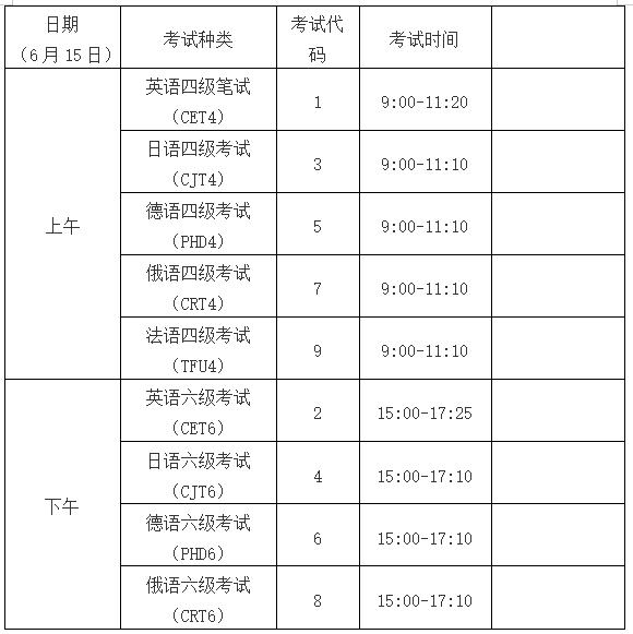 笔试考试时间为6月14日,开考科目为英语、日语、德语、俄语等4个语种的四级和六级以及法语四级。具体安排如下: