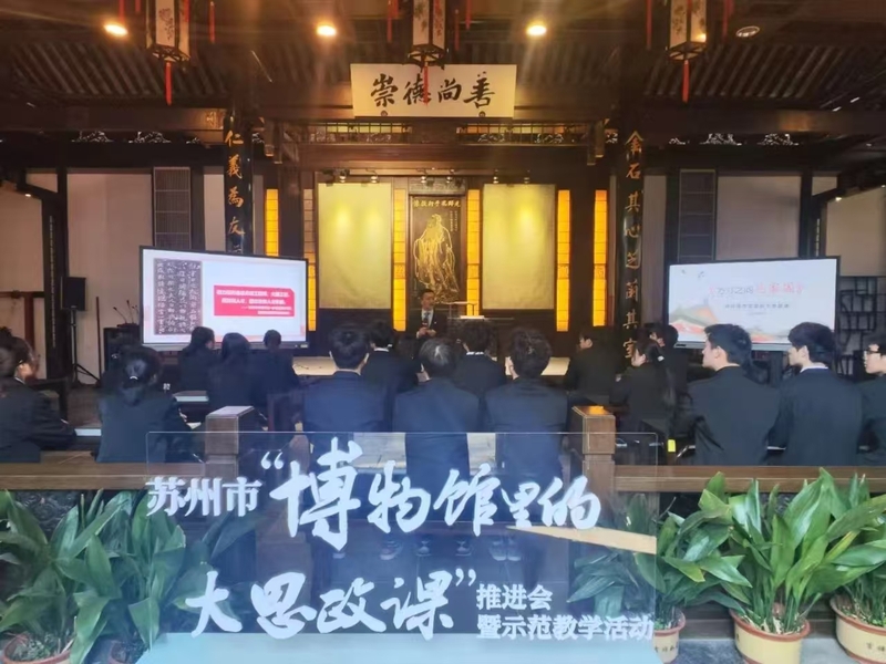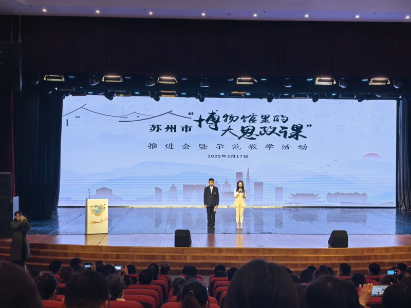 3月17日,苏州市“博物馆里的大思政课”推进会暨示范教学活动成功举行。省委教育工委副书记、厅党组成员潘漫,市委常委、宣传部部长金洁,省教育科学研究院院长、党委书记陆岳新,市委宣传部常务副部长、市新闻出版局局长韦国岭,市委教育工委书记、市教育局局长周志芳,市委党史工办主任徐海明,市文广旅局副局长钱春峰出席活动。